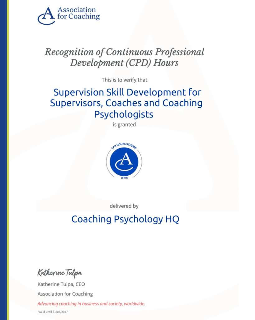 This programme has been created in response to a need for a practical supervision course with strong psychological foundations that will equip participants to supervise coaches and coaching psychologists.